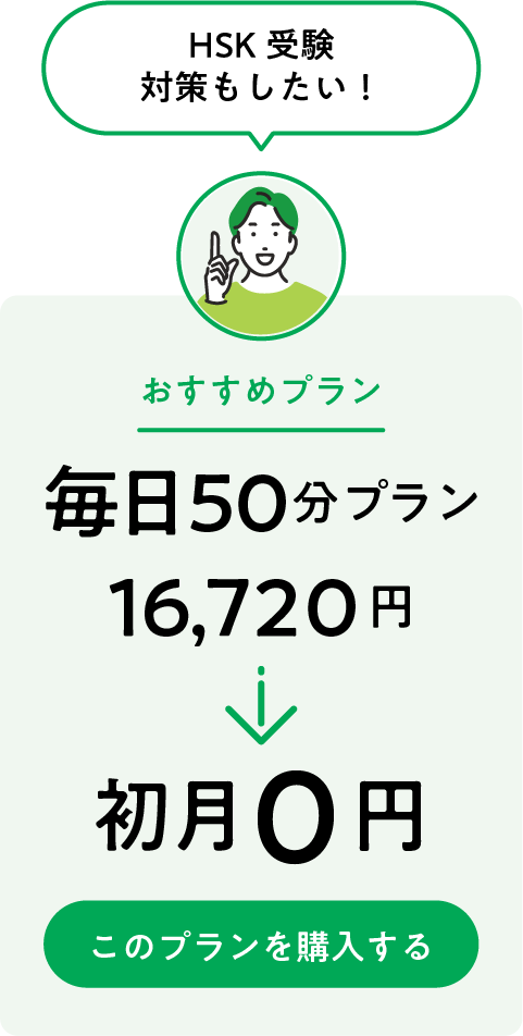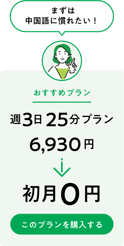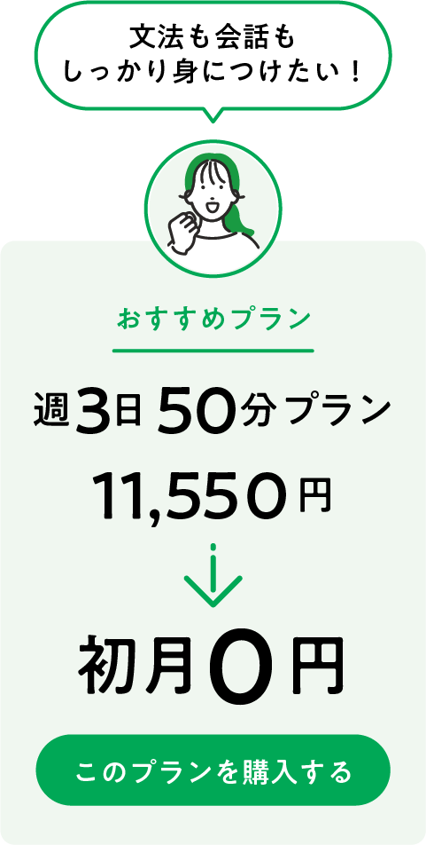 初めてCCレッスンに入会し、定額レッスンプラン(毎日プラン)を購入すると、初月無料でご利用いただけます。