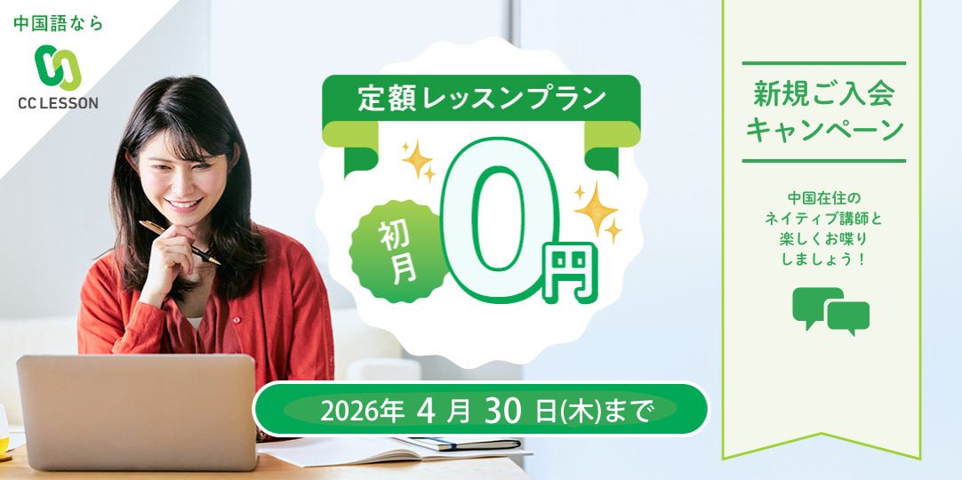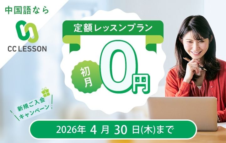 | 内容 | 初めてCCレッスンに入会し、定額レッスンプラン(毎日プラン)を購入すると、初月無料でご利用いただけます。 |